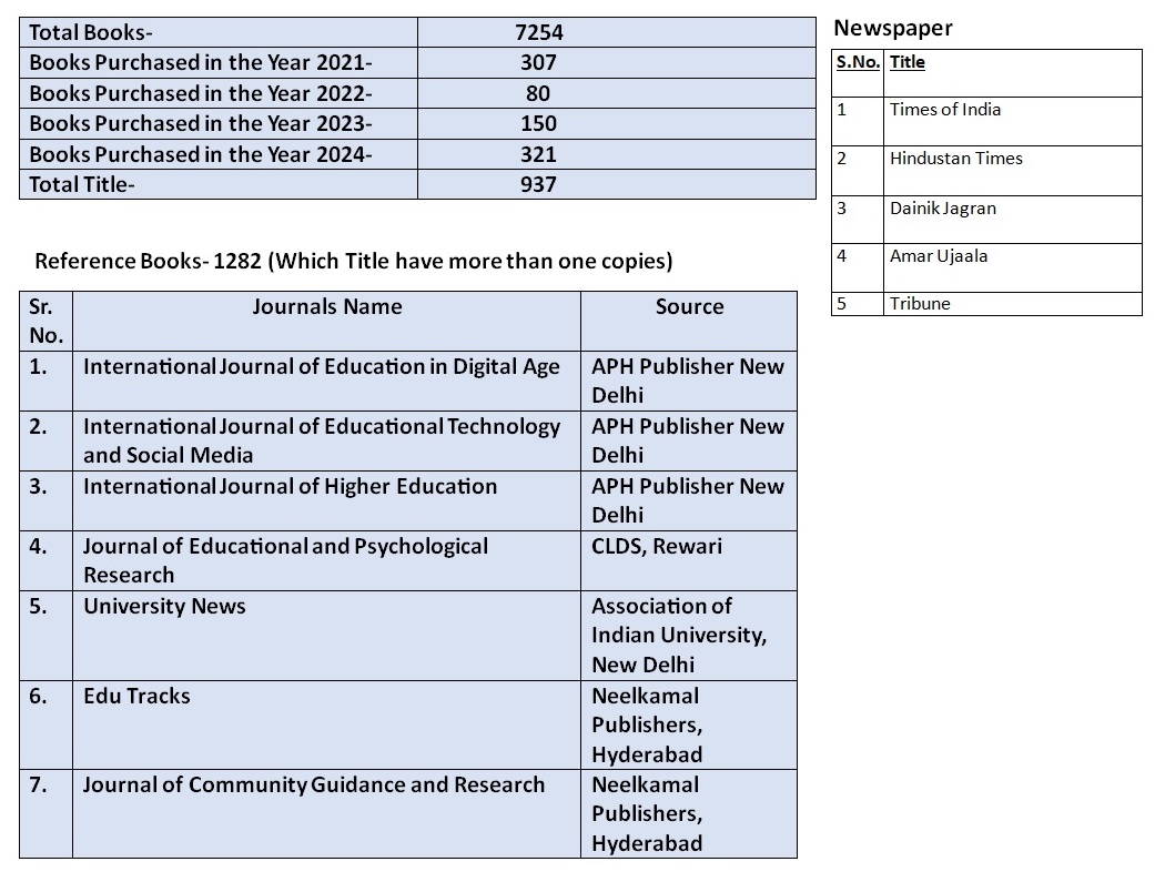 The concept of libraries has revolutionized human creative thinking and mankind has witnessed a sea change in the standard of living as books preserve archival materials and historical records for the coming generation. The primary aim is to provide material to carry out a balance between studies & technology best suited to present conditions and enable the students to compete in the international arena.